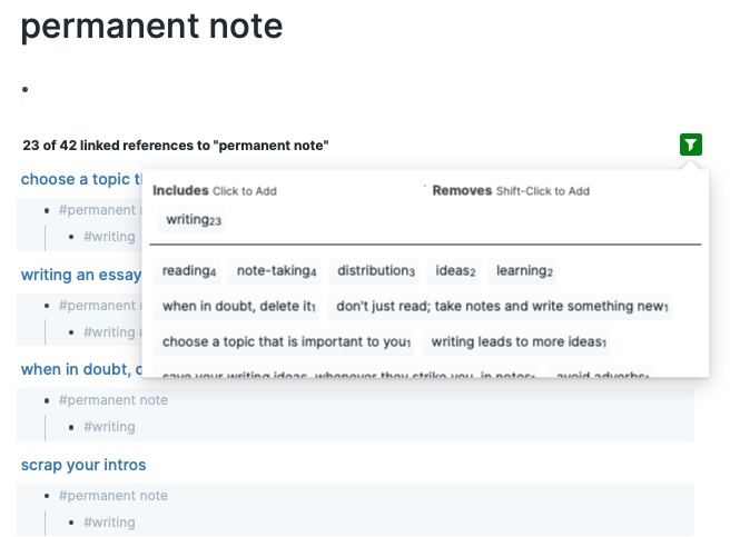 Here’s an example of my #permanent notes filtered on the #writing tag.