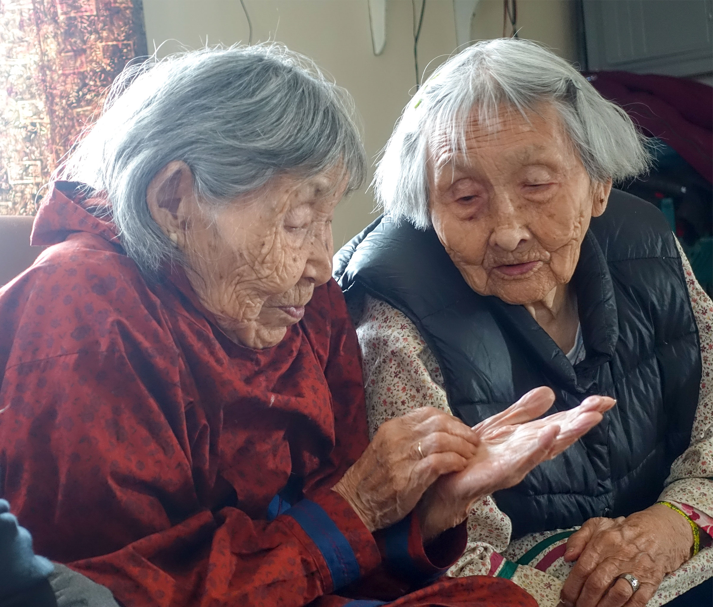 “Now people don’t make atasuaq anymore,” Dull says through an interpreter in her native language of Yugtun. “They only have coats. But we Elders have atasuaq and piluuguk [regalia], which are of the Yup’ik people.”
