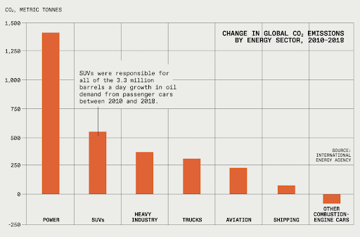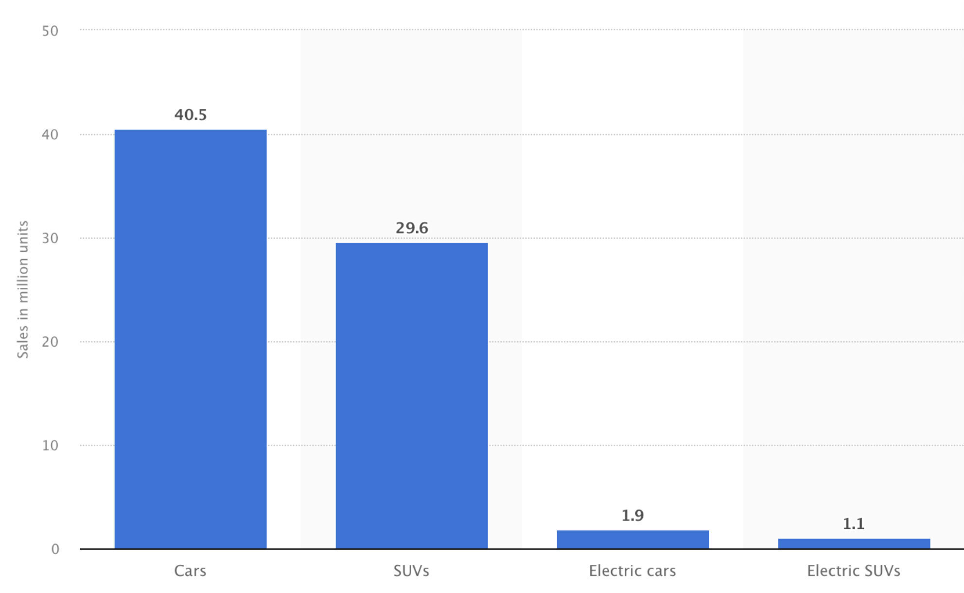 In general, an average SUV emits 25% more carbon than the average car. In 2020, 29.6 million SUVs were sold globally compared to 1.9 million EV cars and 1.1 million electric SUVs.